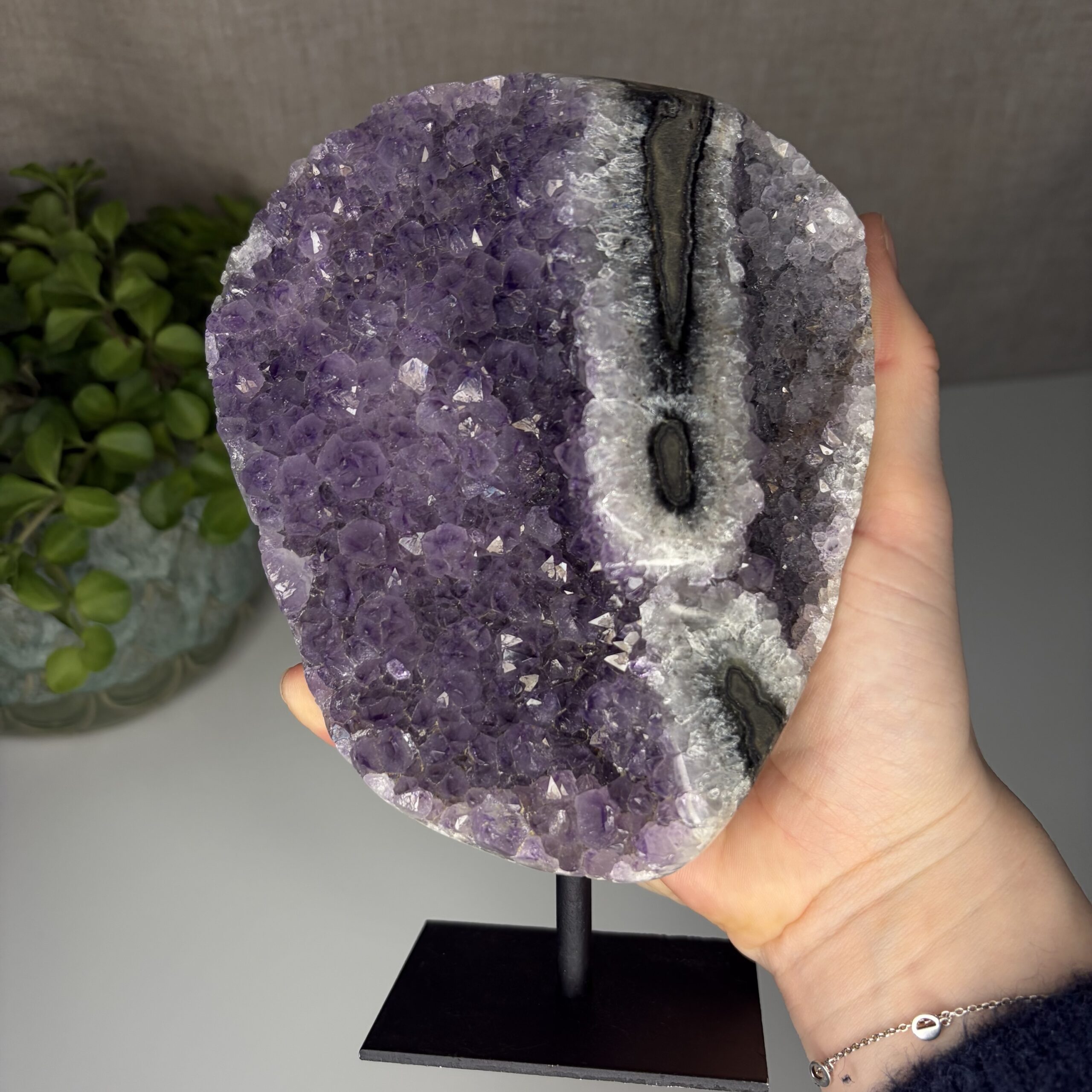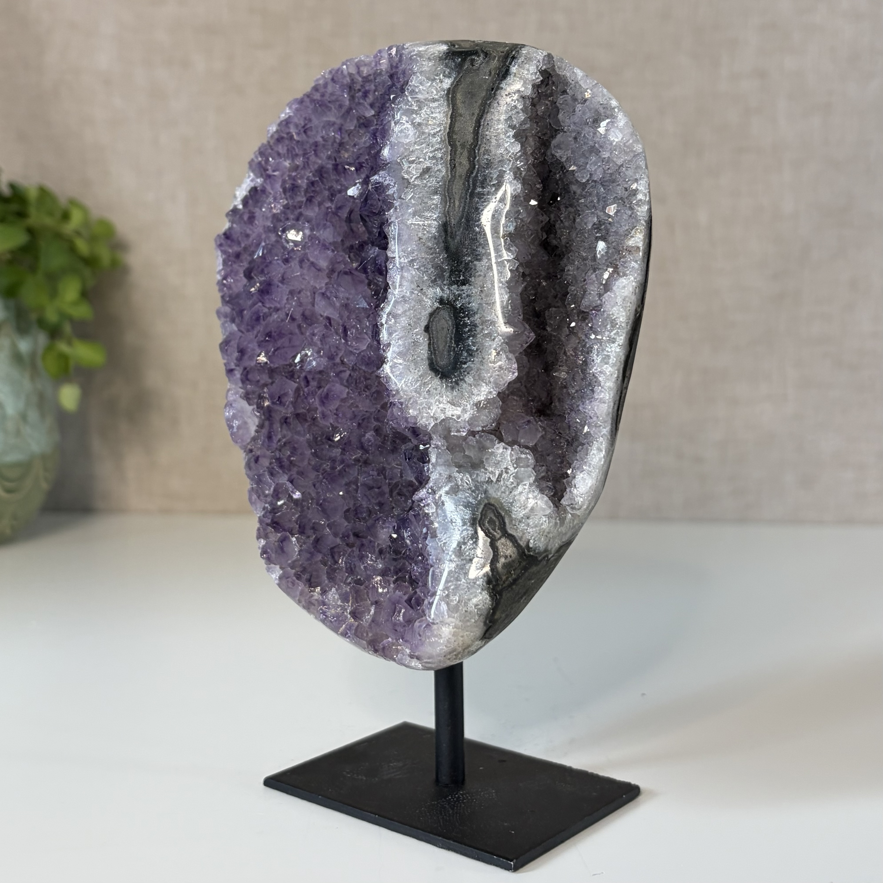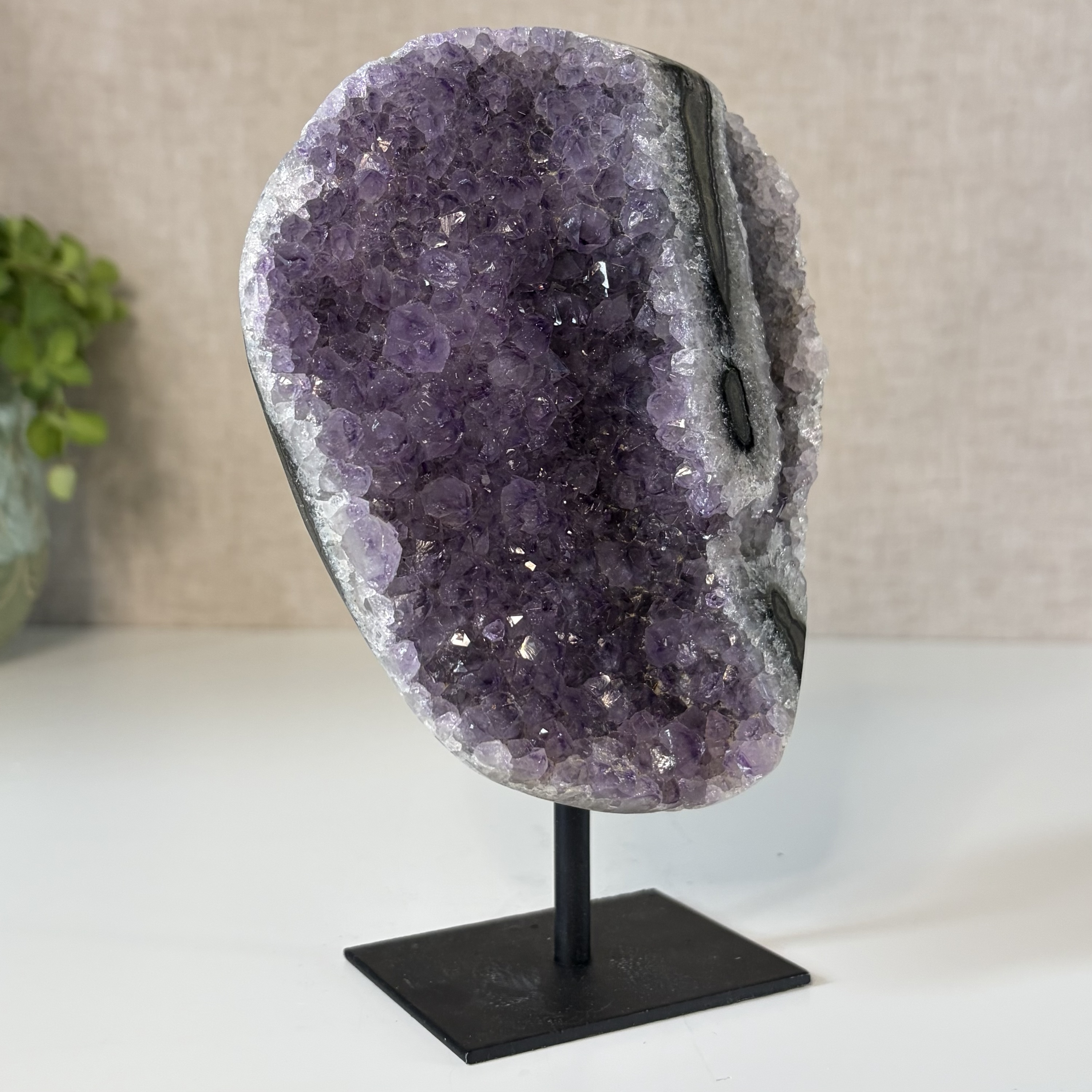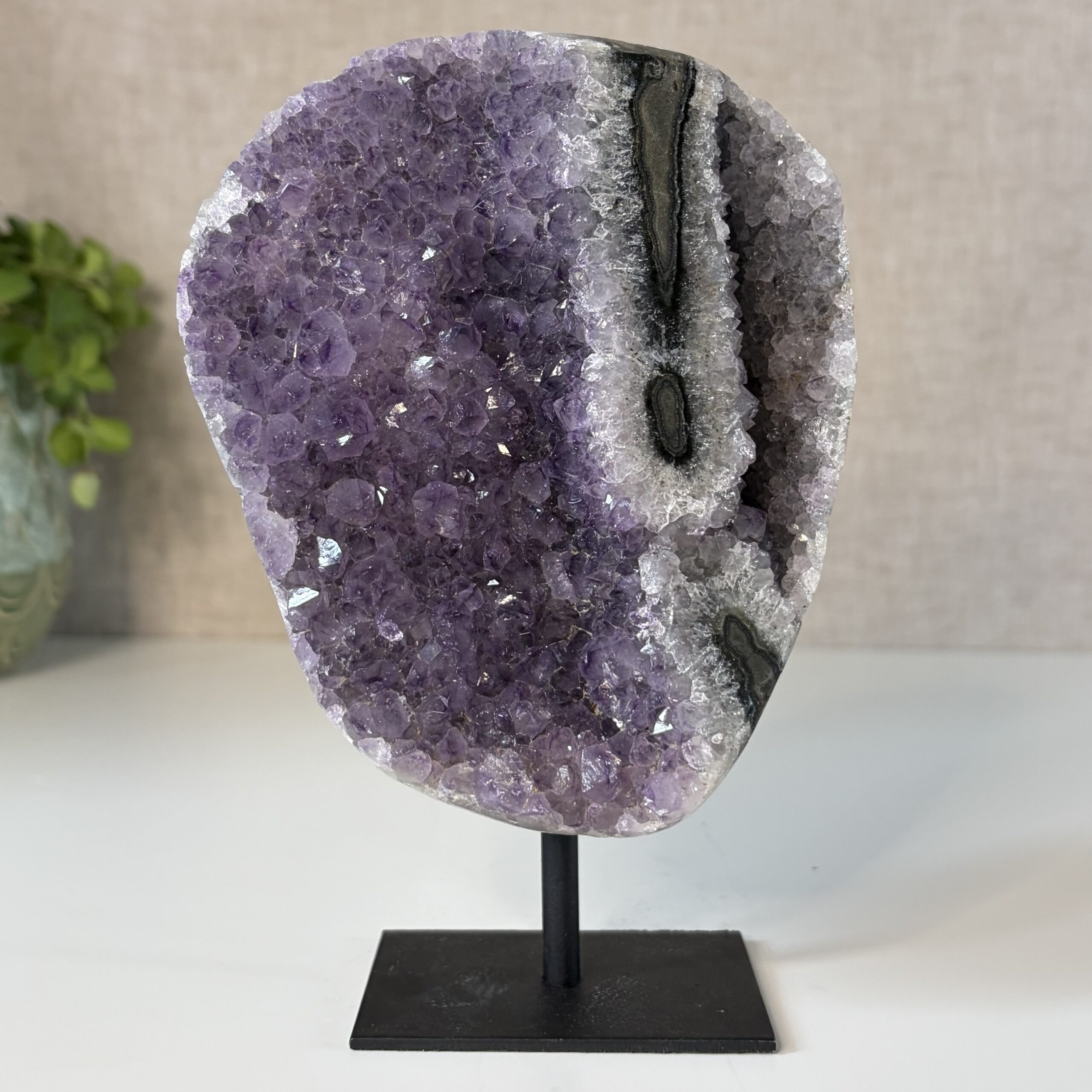Amethist uit Brazilië wordt geassocieerd met balans, ontspanning en emotionele stabiliteit. De steen helpt bij het verminderen van spanning en het bevorderen van helder denken. Ideaal voor in huis, de slaapkamer of een meditatieplek.