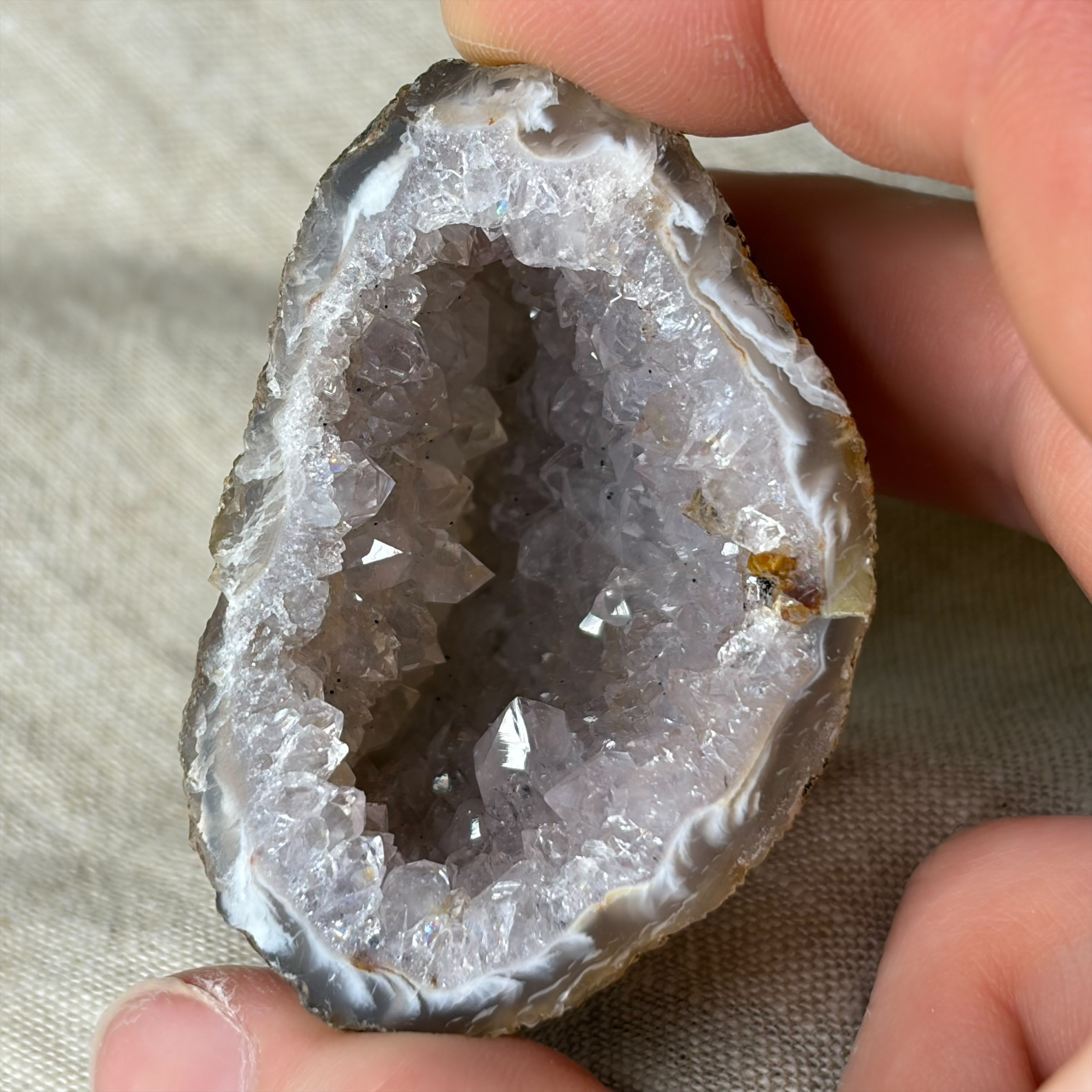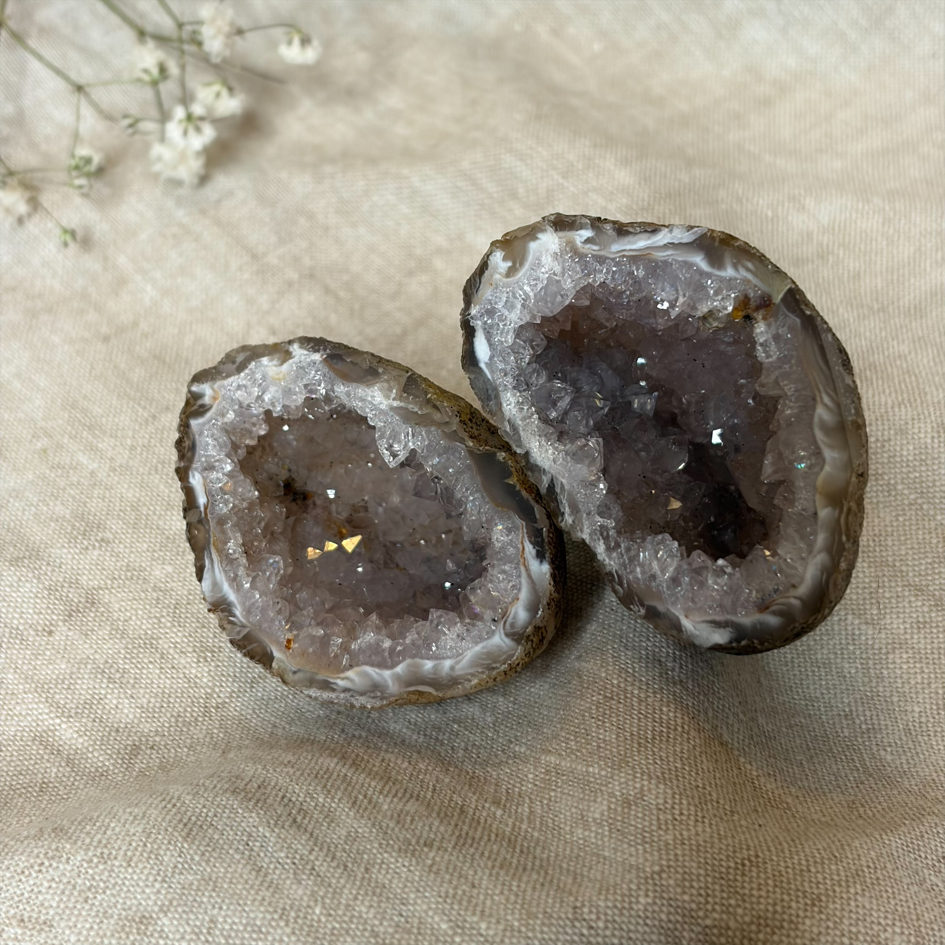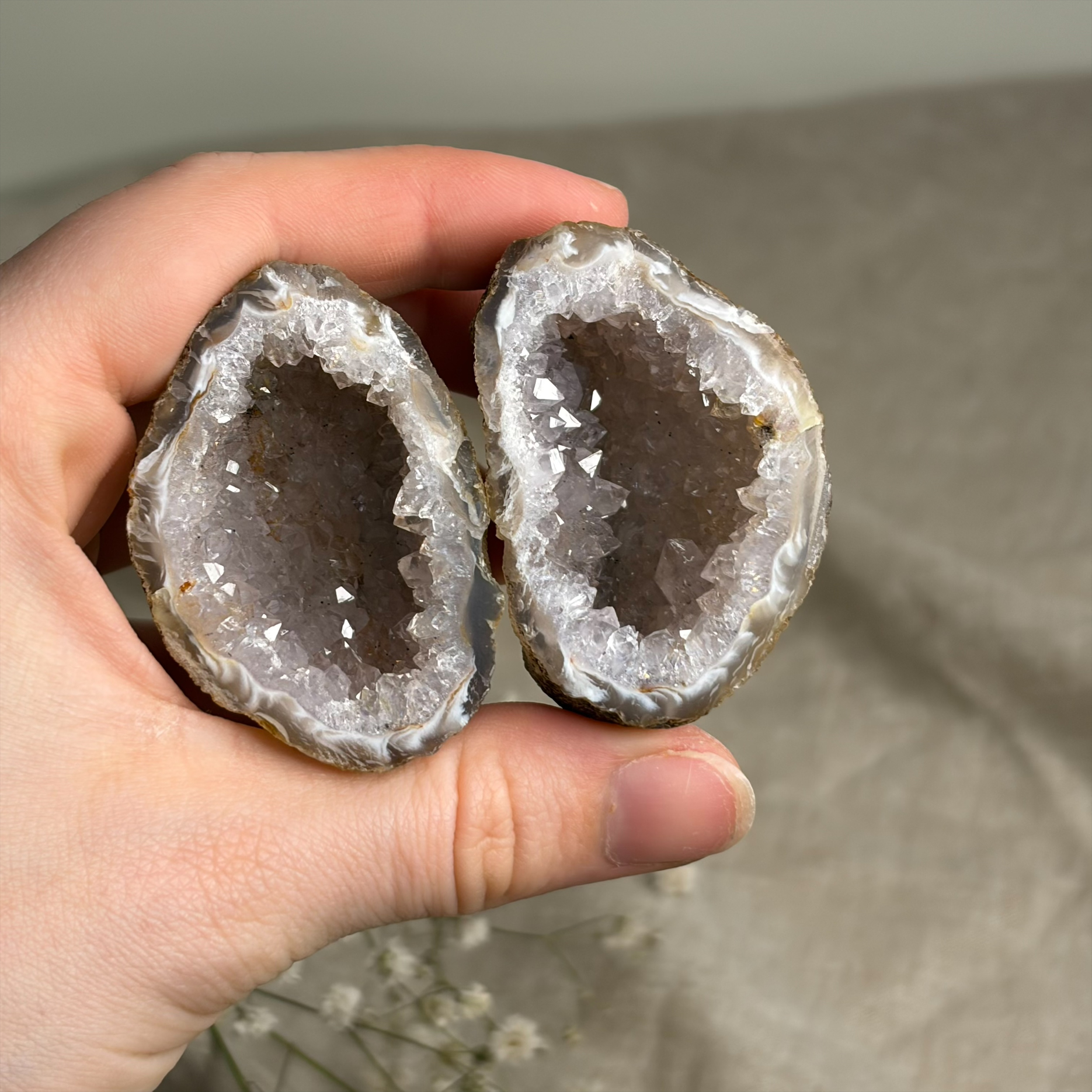 Deze agaat geode uit Brazilië heeft een prachtige, holle structuur met kristalachtige binnenkant. De buitenkant heeft de karakteristieke agaatbanden, terwijl de binnenkant fonkelt met kleine kwartskristallen. Elke geode is uniek en straalt natuurlijke kracht uit.