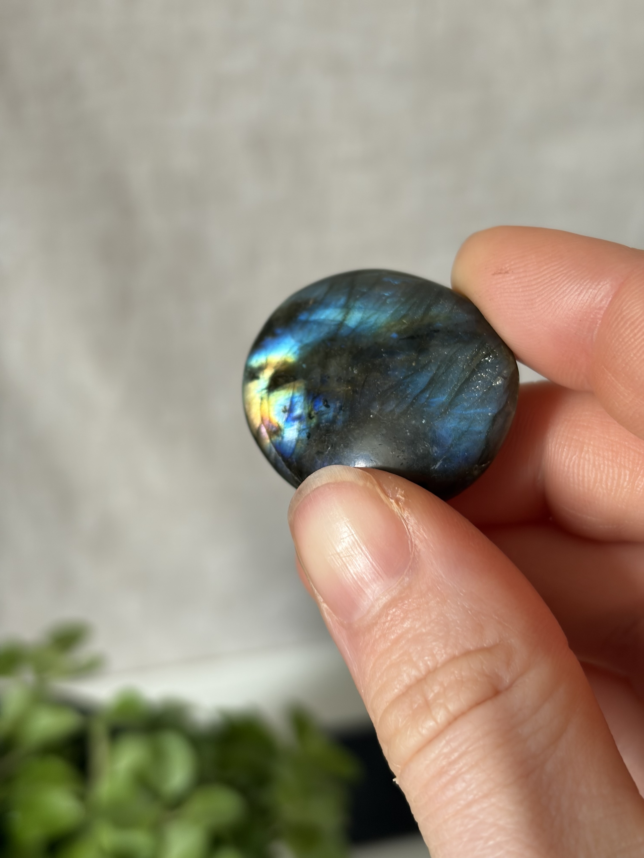 Deze labradoriet uit Madagascar staat bekend om haar spectaculaire kleurenspel, ook wel labradorescentie genoemd. Bij beweging verschijnen tinten blauw, groen en goud, wat elke steen uniek maakt.